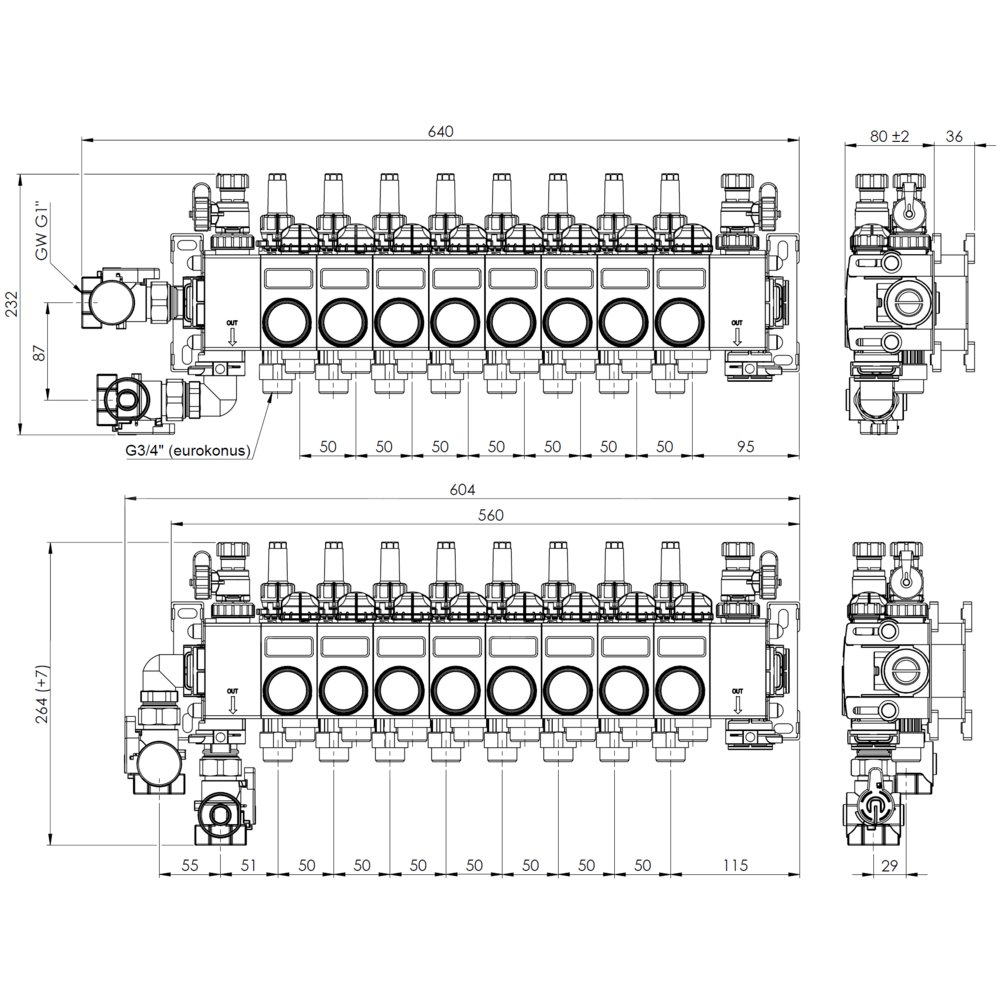 Poliamidowe zawory odcinające ułatwiają pracę konserwacyjne oraz napełnianie oraz płukanie pętli. Zawór na zasilaniu posiada termometr.
