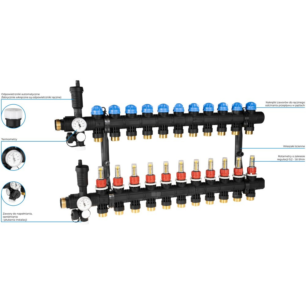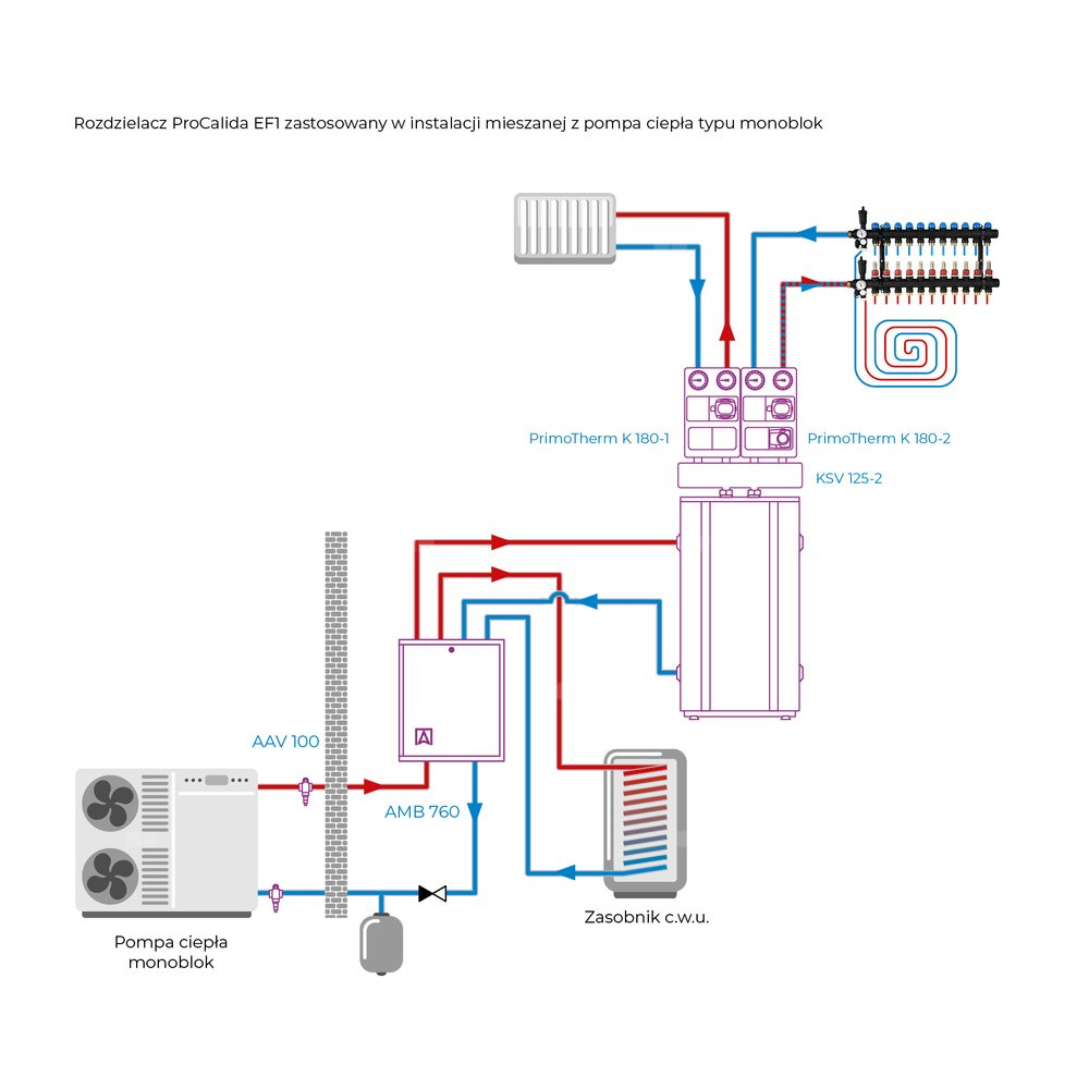 Rozprowadza ciepło/chłód ze źródła na poszczególne pętle instalacji płaszczyznowej.