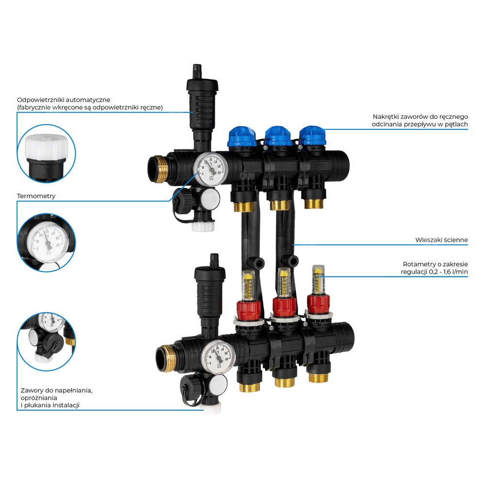 Rozprowadza ciepło/chłód ze źródła na poszczególne pętle instalacji płaszczyznowej.