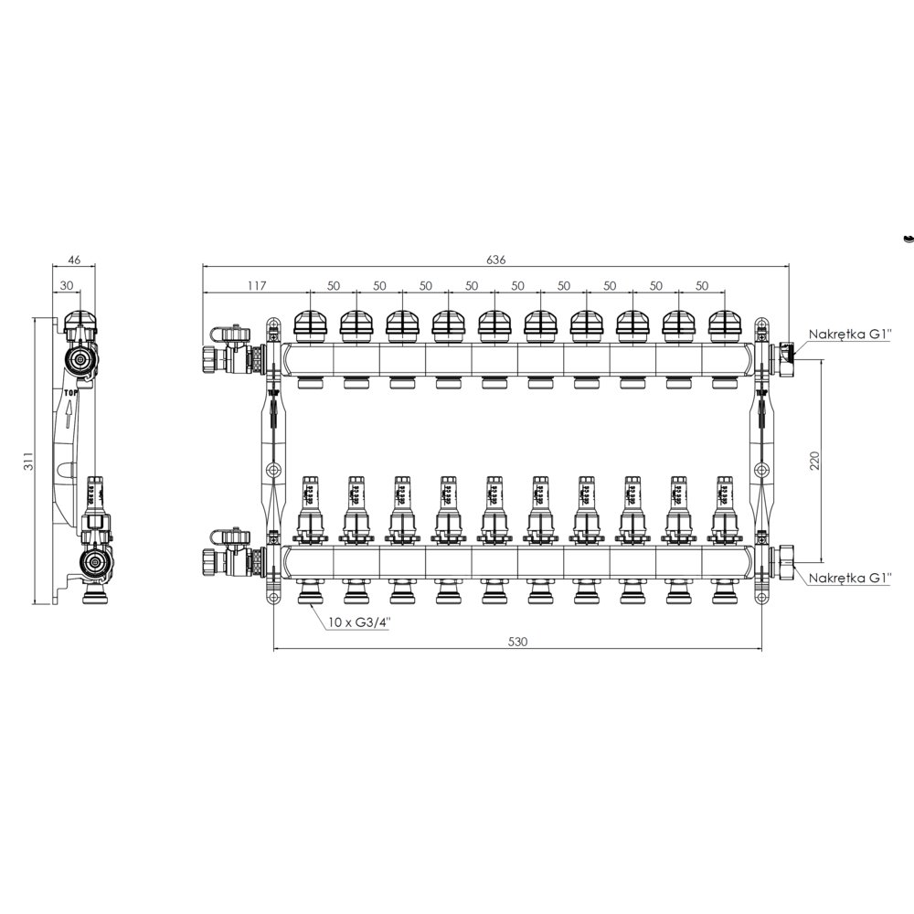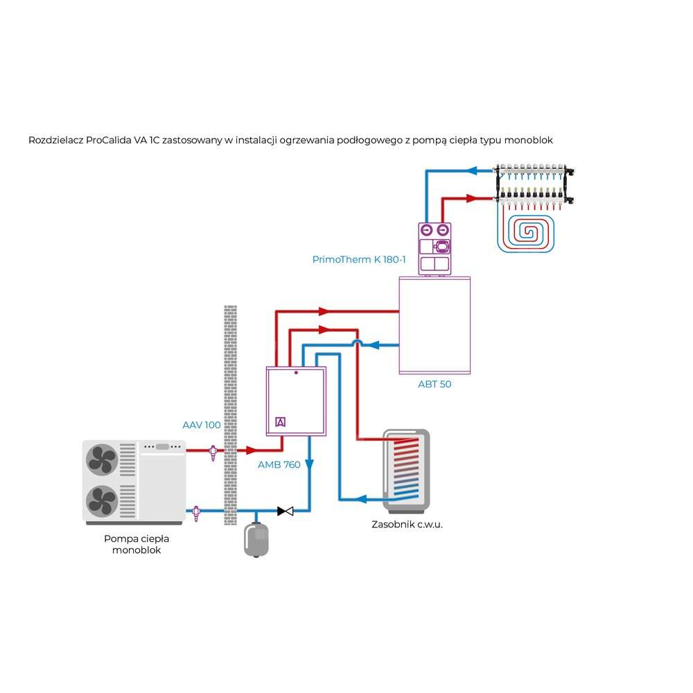 Rozprowadza ciepło/chłód ze źródła na poszczególne pętle instalacji płaszczyznowej.