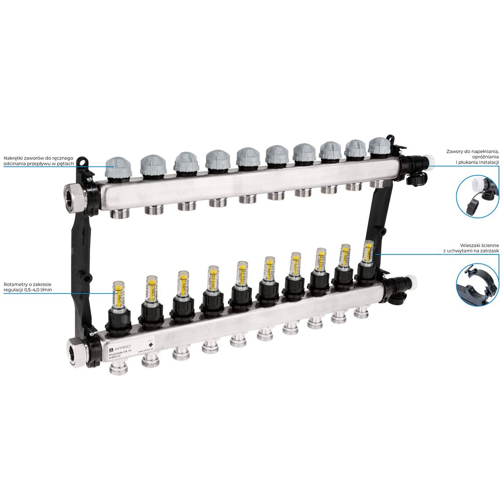Rozdzielacz do ogrzewania podłogowego AFRISO ProCalida VA 1C 10-obieg. stal nierdzewna GZ 1'' x euroconus 3/4''