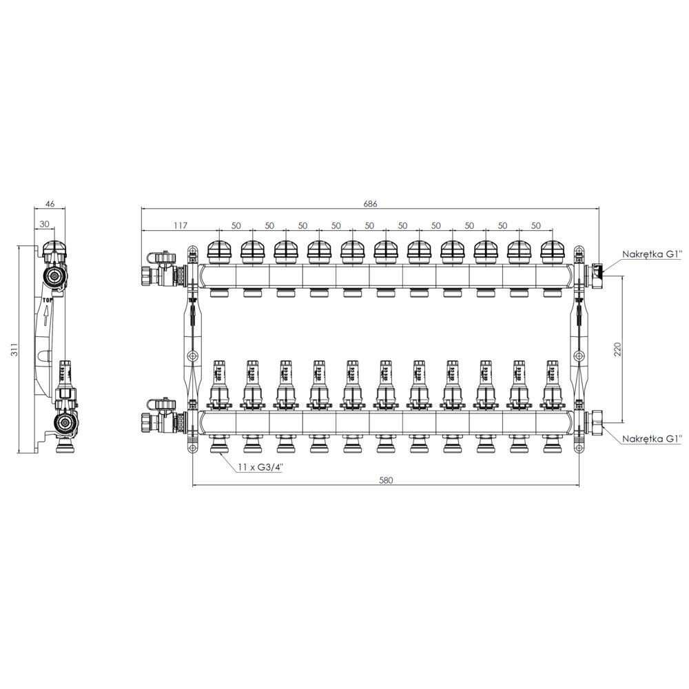 Rozdzielacz do ogrzewania podłogowego AFRISO ProCalida VA 1C 11-obieg. stal nierdzewna GZ 1'' x euroconus 3/4''