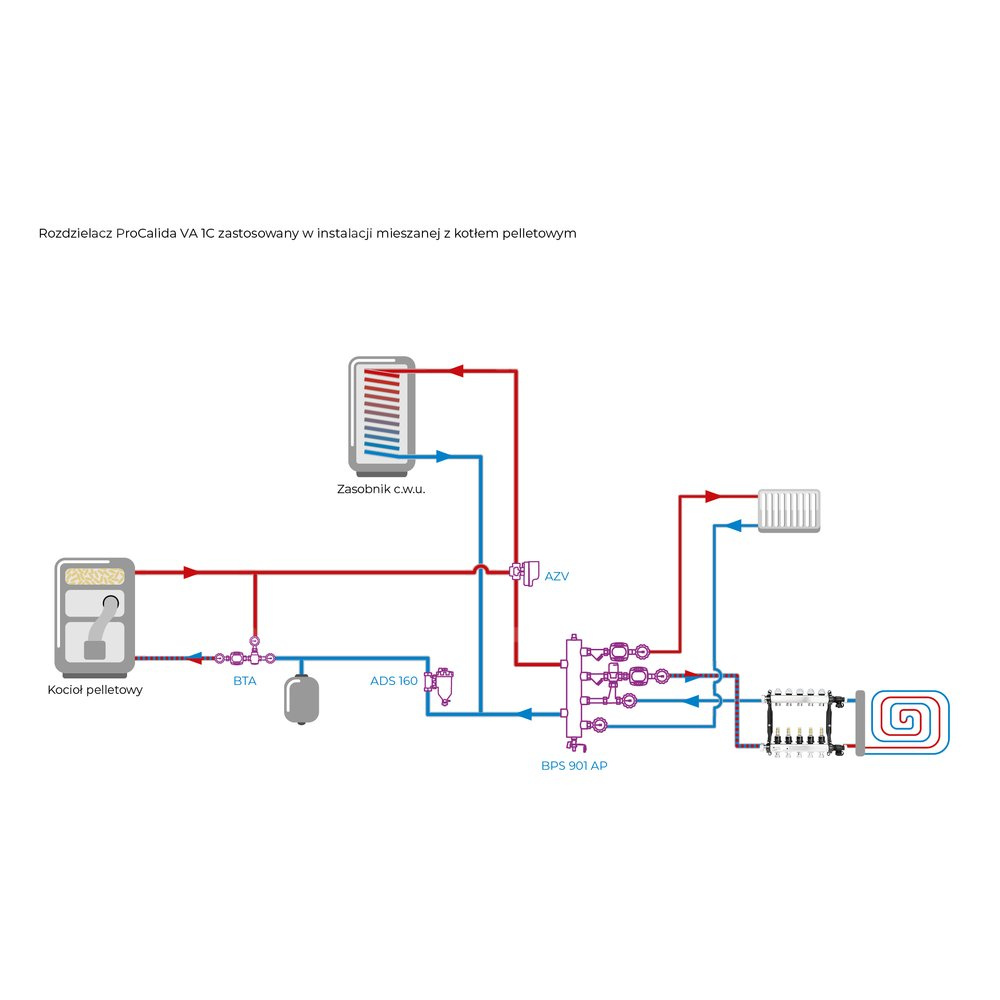 Rozprowadza ciepło/chłód ze źródła na poszczególne pętle instalacji płaszczyznowej.