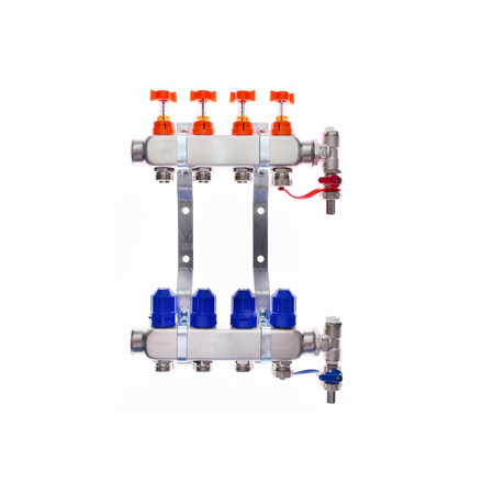 Rozdzielacze ogrzewania podłogowego, przeznaczone do rozdzielenia medium grzew­czego na poszczególne pętle. Belki INOX profilowe, w skład kompletu wchodzi: • rotametry na belce zasilającej o zakresie przepływu 0-5 l • termostatyczne zawory regulacyjne ręczne z pokrętłem, pod siłowniki M30x1,5 • uchwyty montażowe z płaskownika o grubości 3mm z amortyzatorami - 2 szt. • nyple GZ 3/4" z o-ringiem o rozstawie 50mm • korki 1" pod klucz z o-ringiem - 2 szt. • zawory spustowe - 2 szt. • odpowietrzniki ręczne - 2 szt.