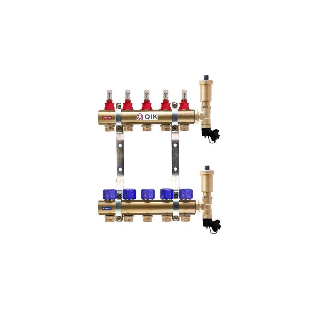 Rozdzielacze ogrzewania podłogowego, przeznaczone do rozdzielenia medium grzew­czego na poszczególne pętle. Belki mosiężne profilowe 1" o wysokości profilu 39mm, w skład kompletu wchodzi: • rotametry na belce zasilającej o zakresie przepływu 0-5 l/min • termostatyczne zawory regulacyjne ręczne z pokrętłem, pod siłowniki M30x1,5 • uchwyty montażowe z płaskownika o grubości 3mm z amortyzatorami - 2 szt. • nyple GZ 3/4" z o-ringiem o rozstawie 50mm • korki 1" pod klucz z o-ringiem - 2 szt. • zawory spustowe - 2 szt. • odpowietrzniki automatyczne - 2 szt.