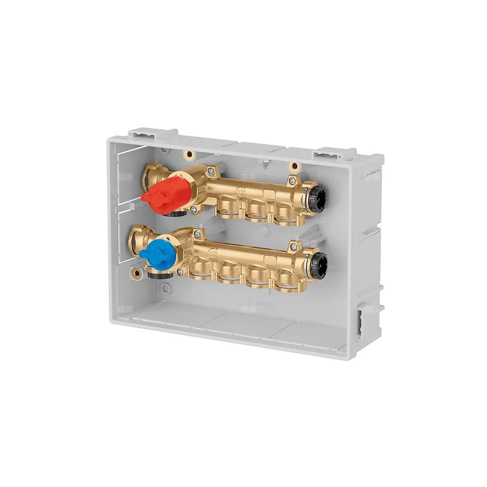 Rozdzielacz z głównymi zaworami odcinającymi z możliwością kontroli W komplecie: - para rozdzielaczy z zaworami odcinającymi; - skrzynka rozdzielacza (270 x 190 x 80 mm) wyposażona we wsporniki i elementy mocujące; - pokrywa zabezpieczająca w trakcie montażu; - 4 zaślepki z klipsami mocującymi. przyłącze zimna wylot: 4 wyjścia , podłączenie zaciskowe. przyłącze ciepła wylot: 3 wyjścia , podłączenie zaciskowe. Maksymalne ciśnienie pracy: 10 bar. Zakres temperatury medium: 5–90 °C. Rozstaw wyjść: 32 mm. Materiał: mosiądz.