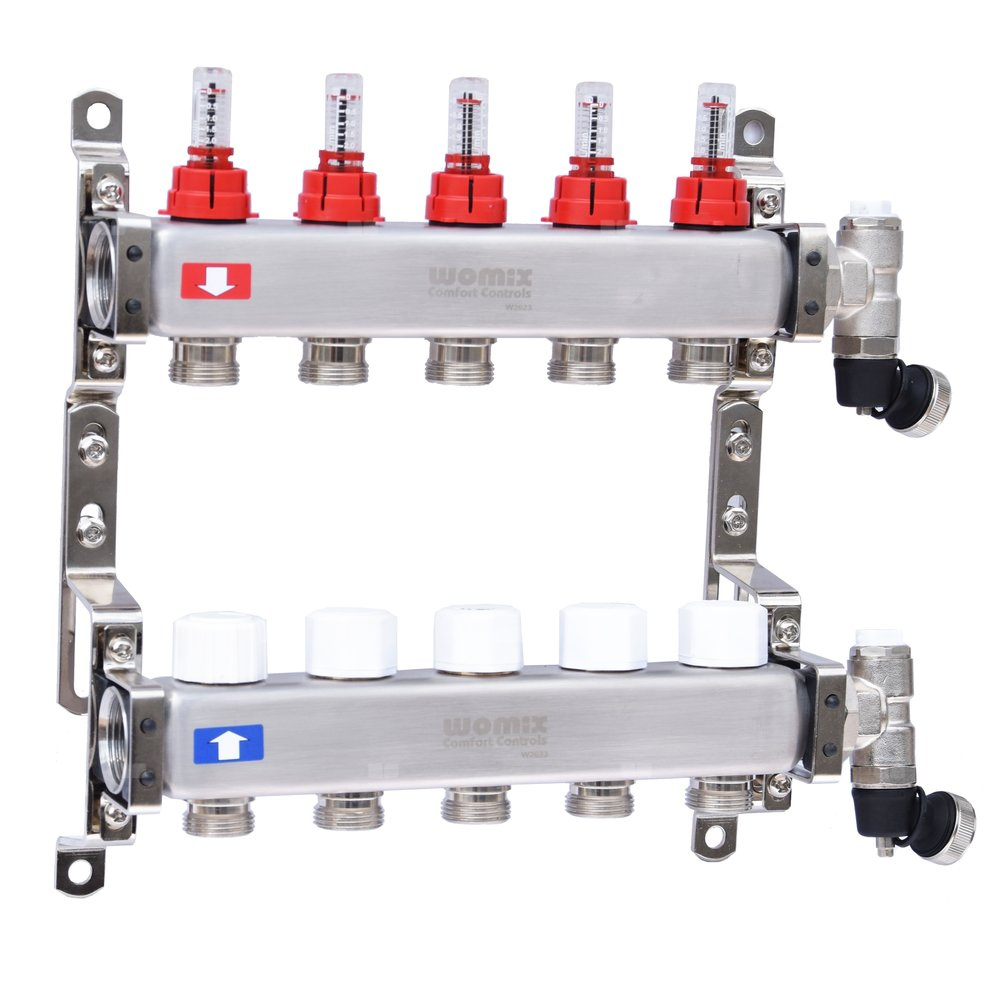 Rozdzielacz do ogrzewania płaszczyznowego na 13 obwodów grzewczych, z nyplami redukcyjnymi 1/2” x 3/4”, z wkładkami termostatycznymi i rotametrami 0 – 5 l/min, 2 odpowietrznikami oraz zaworami spustowymi kątowymi