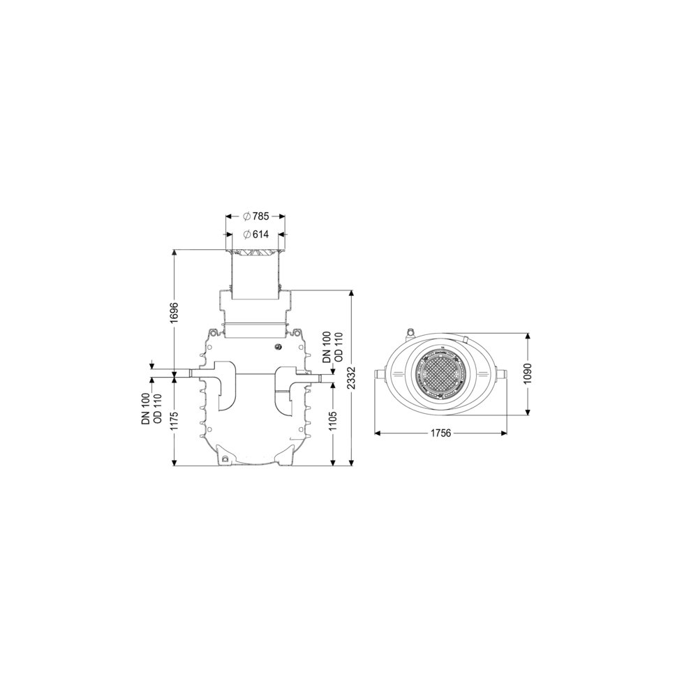 Odstęp między dnem rury dopływowej a dnem zbiornika: 1175 mm