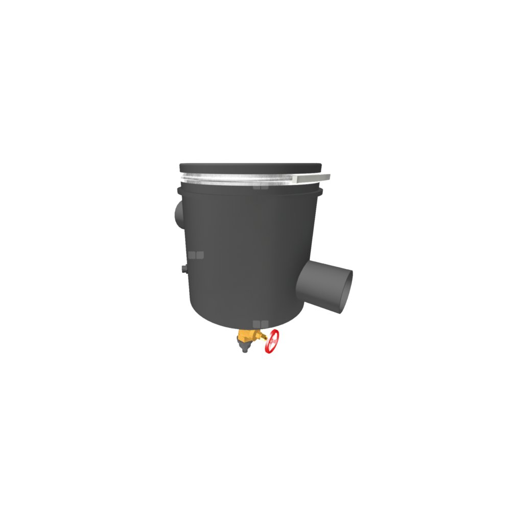 Urządzenie do pobierania próbek z separatorów, przepływowe, z odpływem poziomym, z otworem rewizyjnym i lejkowatym odprowadzeniem osadu, z zaworem odcinającym 3/4". Z zamkniętą w sposób chroniący przed wydostawaniem się nieprzyjemnych zapachów pokrywą z zamknięciem szybkomocującym.