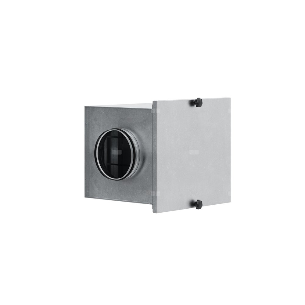 • Obudowa z blachy stalowej wyposażona jest w rurowy króciec przyłączeniowy z blachy ocynkowanej umożliwiający montaż skrzynki filtrującej w kanale powietrza doprowadzanego i kasety filtracyjnej F5.