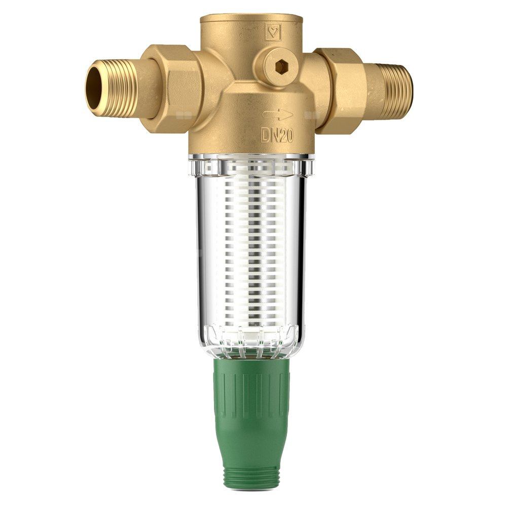 Filtr wody pitnej z możliwością płukania, mosiężna obudowa, pojemnik wykonany z przezroczystego poliamidu PA12, filtr ze stali nierdzewnej (80-100 µm), maks. temperatura robocza 40 °C, maks. ciśnienie robocze 16 bar, w zestawie z przyłączami