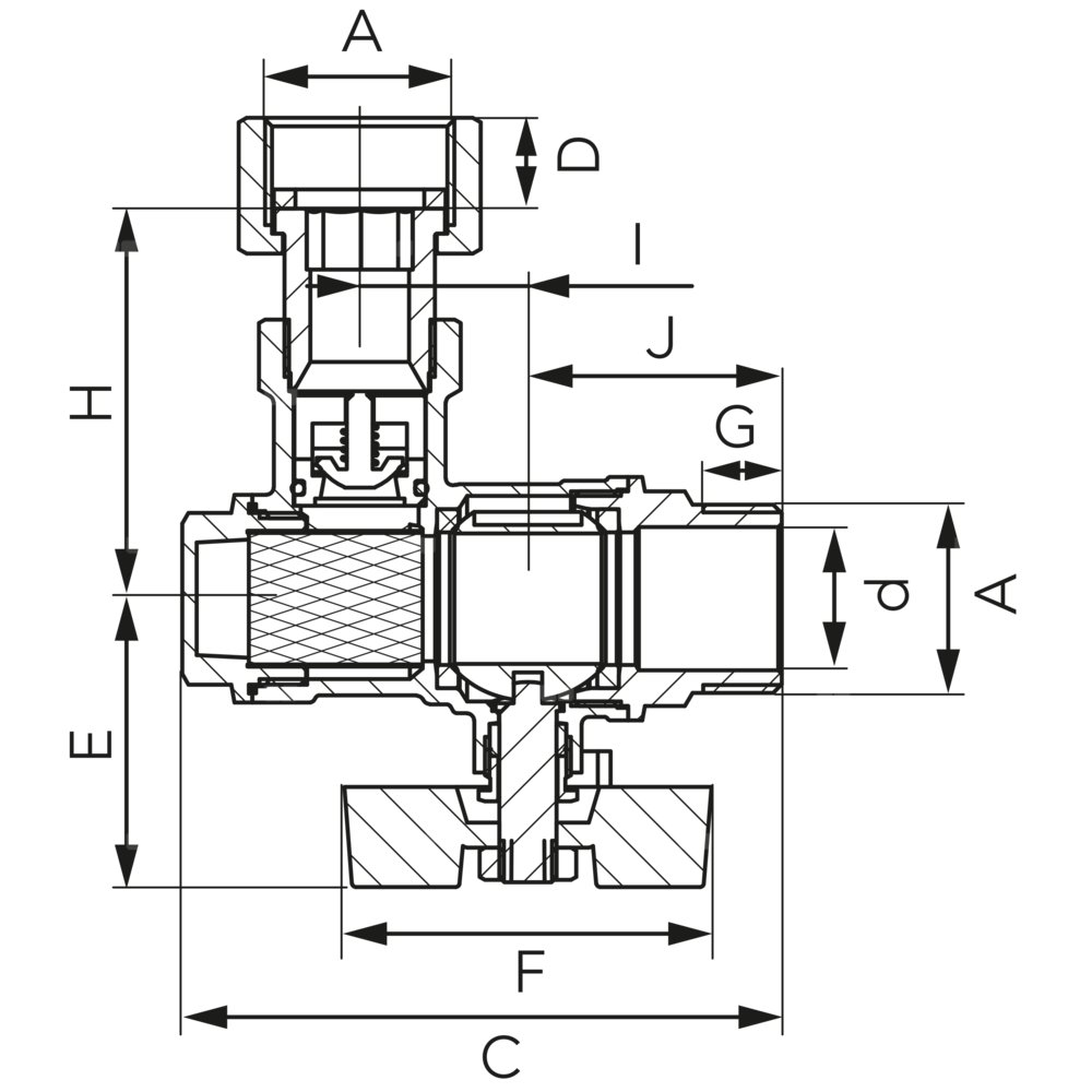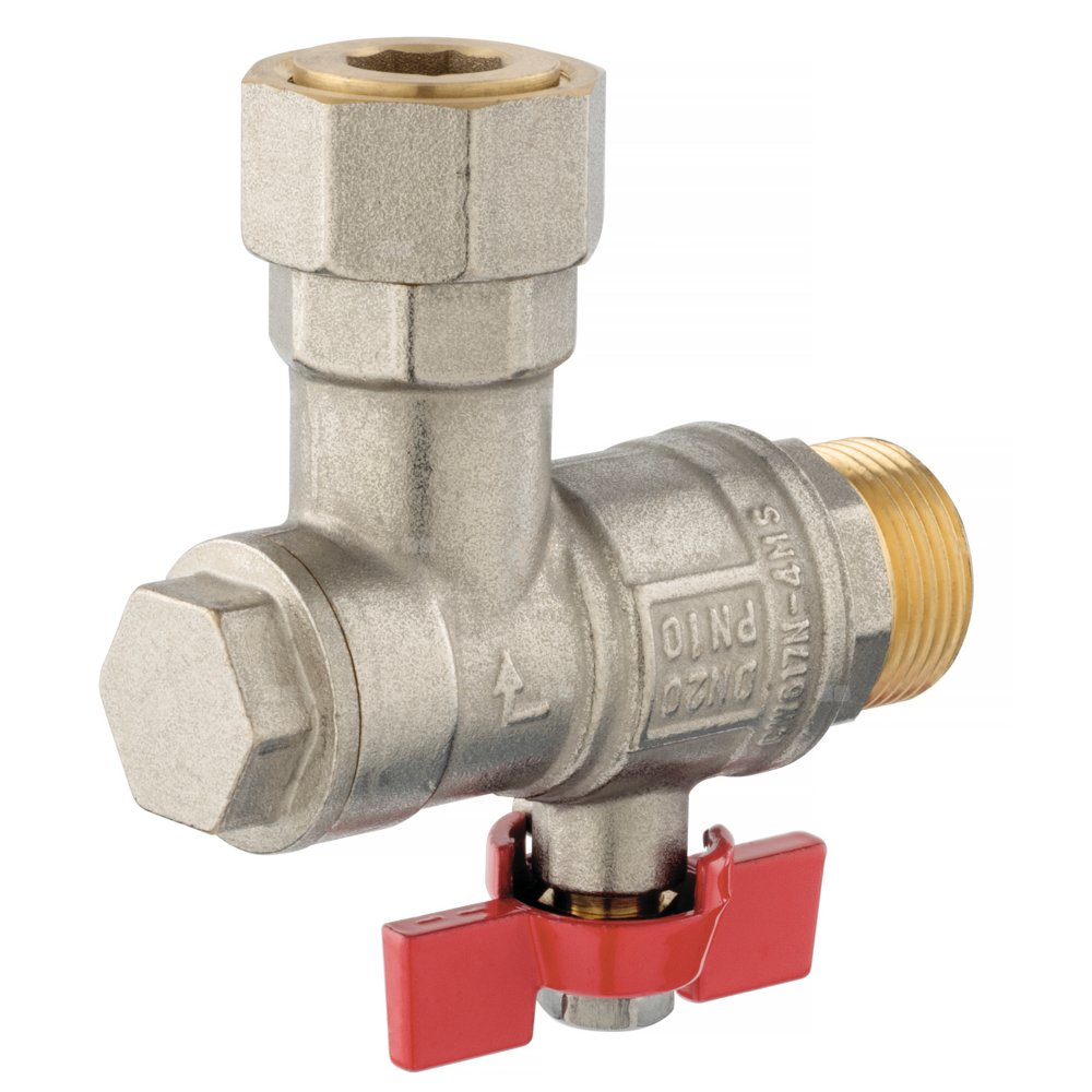 Zawór kątowy z obrotową nakrętką. Uszczelnienie płaskie, uszczelka EPDM. Konstrukcja zaworu umożliwia prosty montaż i demontaż urządzeń. Zawór wykonany jest z wysokogatunkowego mosiądzu CW617N - 4MS. Zastosowanie w instalacjach, gdzie medium to woda lub woda/glikol. Uchwyt zaworu w postaci motylka umieszczony jest pod korpusem zaworu. Zawór posiada filtr ze stali nierdzewnej AISI304 oraz zawór zwrotny.
