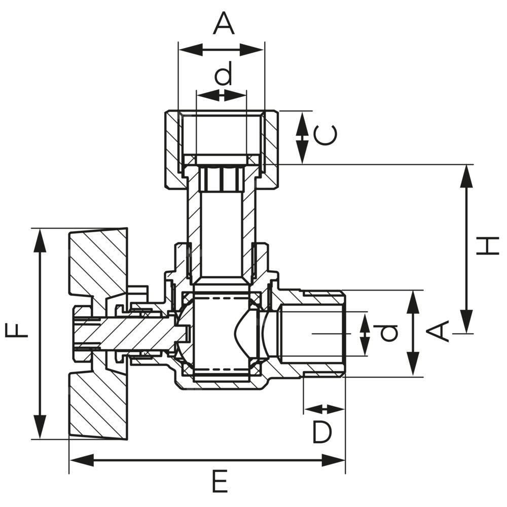 Zawór kątowy z obrotową nakrętką. Uszczelnienie płaskie, uszczelka EPDM. Konstrukcja zaworu umożliwia prosty montaż i demontaż urządzeń. Zawór wykonany jest z wysokogatunkowego mosiądzu CW617N - 4MS. Zastosowanie w instalacjach, gdzie medium to woda lub woda/glikol.