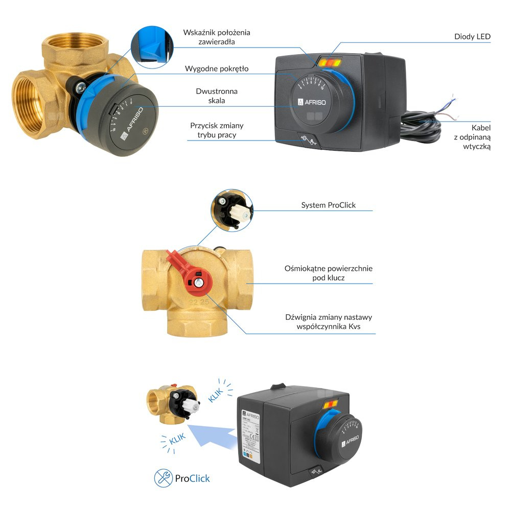 Urządzenia wyposażone w system ProClick – pozwala na bezpośredni montaż siłownika na zaworze bez użycia dodatkowych narzędzi.