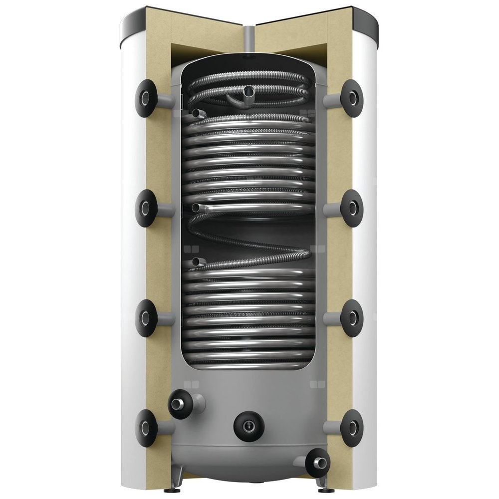 Zasobnik buforowy do magazynowania wody grzewczej i chłodniczej oraz do przygotowania ciepłej wody użytkowej metodą przepływową. W wersji stojącej, do wyboru z jedną lub dwiema wężownicami do podłączenia zewnętrznych źródeł energii. Wężownica ze stali nierdzewnej pełniąca funkcję wbudowanego podgrzewacza przepływowego. Powrót ogrzewania do zasobnika odbywa się rurą stratyfikacyjną. Dwie listwy zaciskowe umożliwiają elastyczny montaż czujników temperatury.