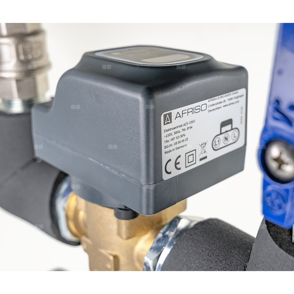 Przełącza przepływ pomiędzy dwoma strefami: instalacją c.o./buforem lub zasobnikiem c.w.u za pomocą zaworu przełączającego 3-drogowego AZV.