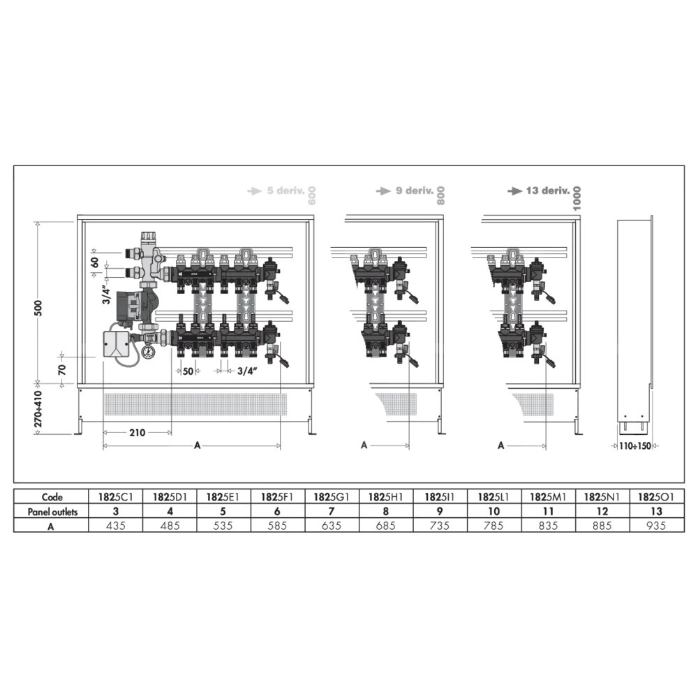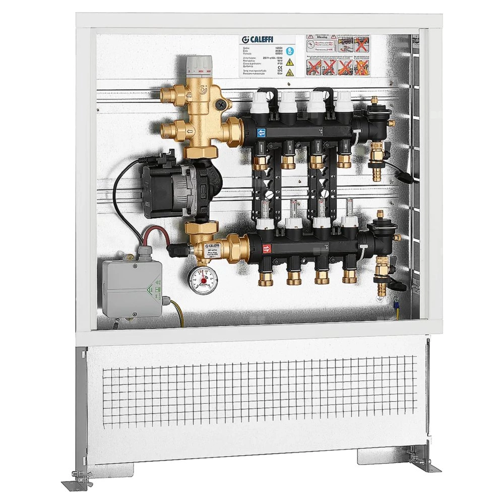 Zespół regulacyjny – regulacja stałotemperaturowa. Wstępnie zmontowany w skrzynce inspekcyjnej W zestawie: - termostatyczny układ regulacji; - para rozdzielaczy z kompozytu z wbudowanymi przepływomierzami i zaworami odcinającymi; - termostat bezpieczeństwa; - wysokowydajna pompa UPM3 Auto L 25-70; - skrzynka inspekcyjna naścienna ze wspornikami podłogowymi. Przyłącze: G 3/4" A (ISO 228-1) GZ, Podłączenie do złączek Caleffi. przyłącza wylot: G 3/4" A (ISO 228-1) GZ, 11 wyjść. Maksymalne ciśnienie pracy: 6 bar. Zakres regulacji temperatury: 25–55 °C. Zasilanie elektryczne: 230 V (AC). Szerokość: 1000.