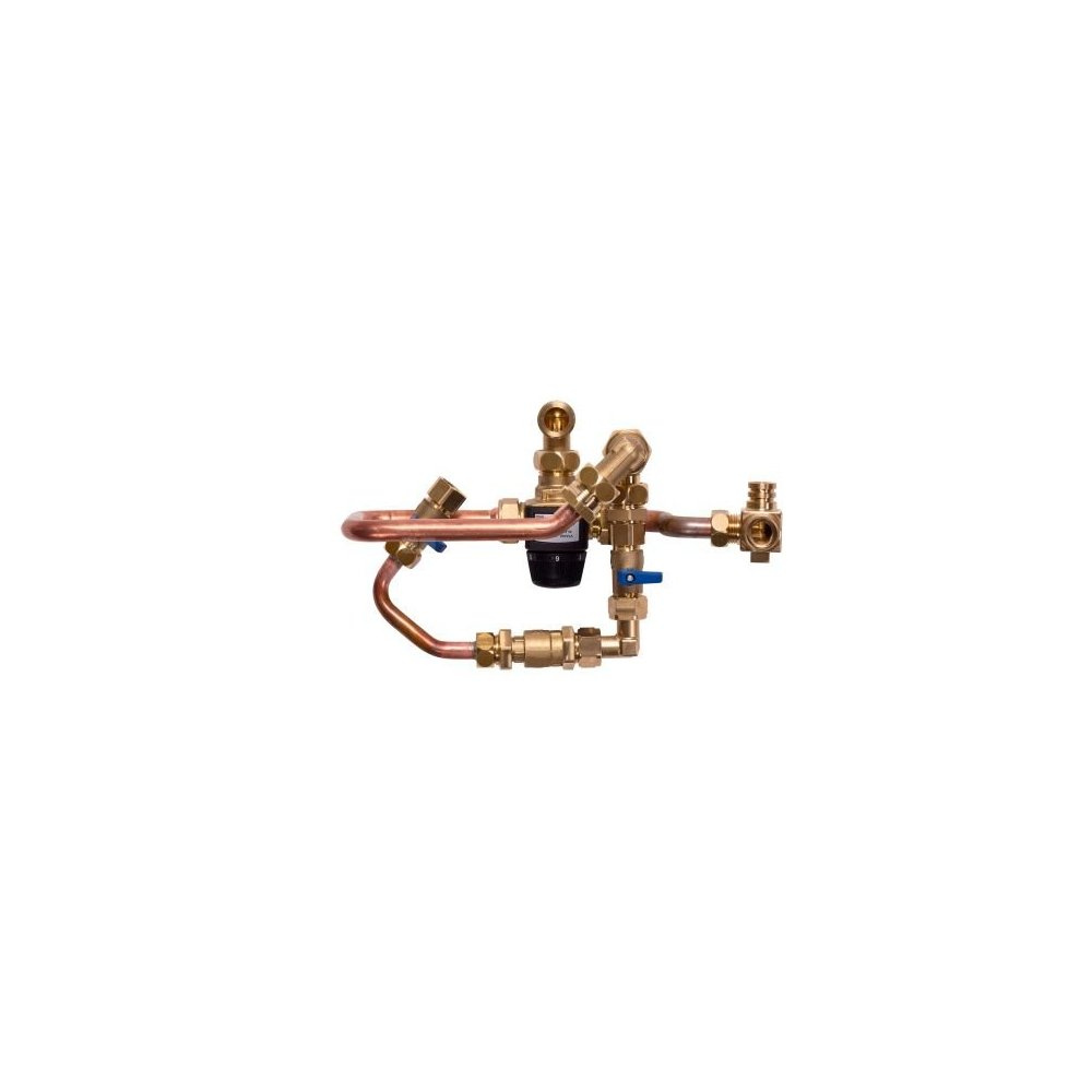 Zestaw do napełniania z zaworem termostatycznym. Złącze do powrotu c.w.u. i ogrzewania, kontrola maks. temperatury przy wylocie.