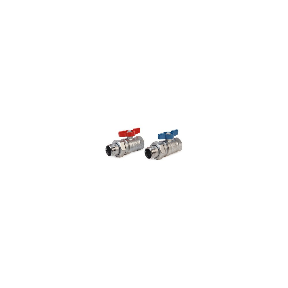 Zestaw dwóch zaworów kulowych z półśrubunkiem nakrętno-wkrętnym z czerwonym i niebieskim motylkiem. Wykończenie chromowane. Zakres temperatury pracy -20÷185°C.