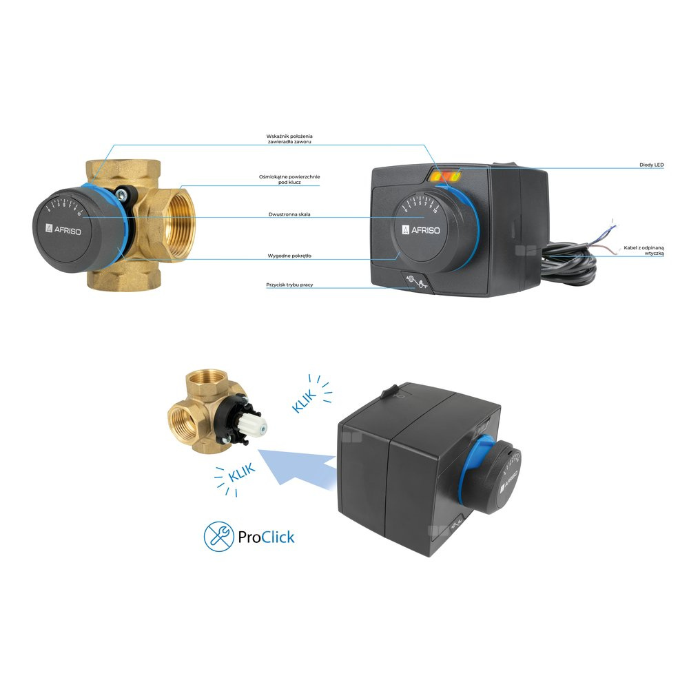 Urządzenia wyposażone w system ProClick – pozwala na bezpośredni montaż siłownika na zaworze bez użycia dodatkowych narzędzi.