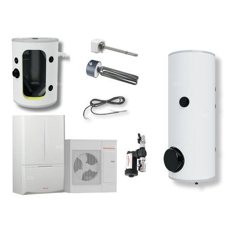 Magis PRO 9 V2 M300 B100 to zestaw składający się pompy ciepła typu split Magis PRO 9 V2, zasobnika c.w.u. o pojemności 300l z grzałką zasilaną jednofazowo o mocy 2,5 kW a także bufor do c.o. o pojemności 100l z grzałką zasilaną trójfazowo o mocy 6,0 kW. Dodatkowo zestaw zawiera sondę do zasobnika, filtr magnetyczny z zaworami i zestaw ochrony antyzamrożeniowej do jednostki zewnętrznej (zainstalowany fabrycznie).